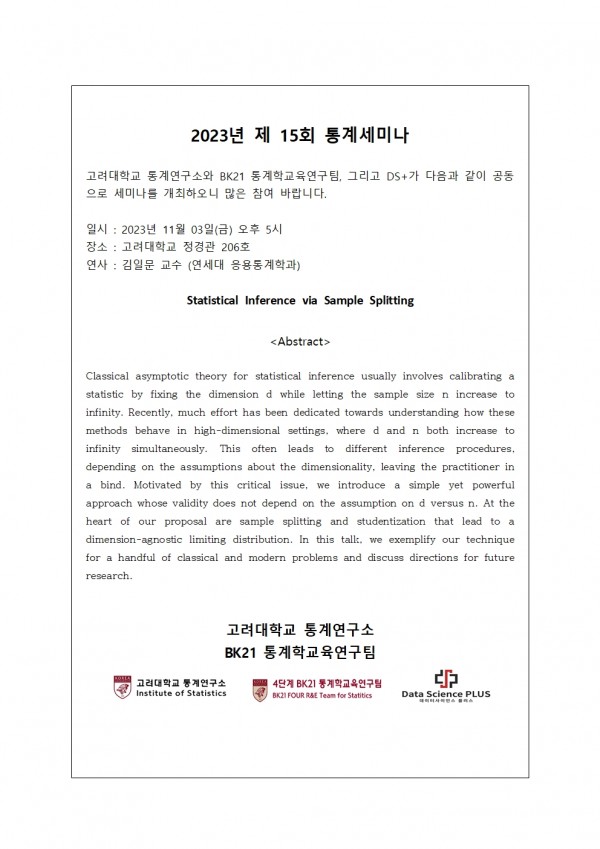 DS+, BK 2023년도 제 15회 통계세미나 개최 안내(11/3(금))