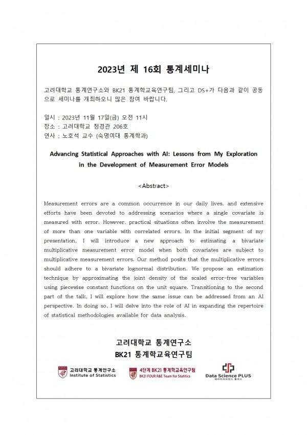 DS+, BK 2023년도 제 16회 통계세미나 개최 안내(11/17(금))