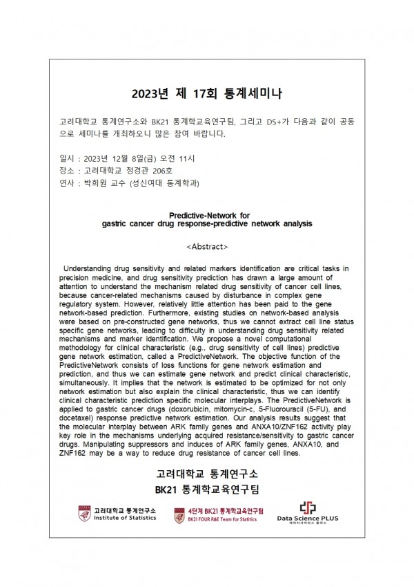 DS+, BK 2023년도 제 17회 통계세미나 개최 안내(12/08(금))