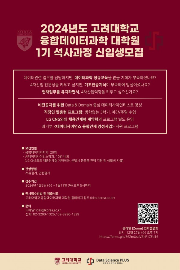 2024년도 고려대학교 융합데이터과학대학원 1기 신입생 모집 안내