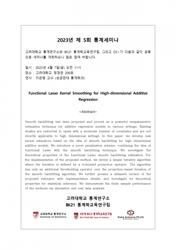 고려대학교 통계학과 통계연구소, BK21 통계학교육연구팀과 DS+ 사업단 주최로 이루어지는 세미나입니다.