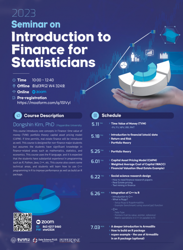 [충남대 DS플러스] 학술세미나 개최 안내(05/11(목)~07/03(월) : 총 7회) DS플러스 2023-04-25 DS플러스 0 975 2023.04.25 10:13 1. 일시 : 2023.05.11.(목) ~ 07.03.(월) 중 7회 (상세 스케줄은 포스터 참조) 10:00 ~ 12:40 2. 장소 : 충남대학교 W4 324호 및 zoom (ID : 863 4217 5460 / PW : stat2324) 3. 연사 : 김동신 교수(페퍼다인 대학교)