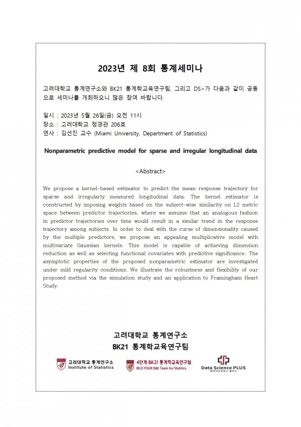 고려대학교 통계학과 통계연구소, BK21 통계학교육연구팀과 DS+ 사업단 주최로 이루어지는 세미나입니다.