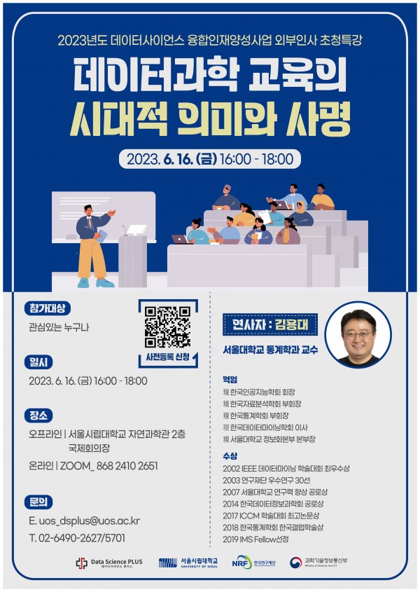 [서울시립대 DS플러스] 특강 개최 안내(06/16(금)) DS플러스 2023-06-01 DS플러스 0 942 2023.06.01 11:30 서울시립대학교 DS플러스 사업단에서 위와 같이 특강을 개최하오니 관심있는 분들의 많은 참여 바랍니다. 1. 일시 : 2023.06.16(금) 16:00 ~ 18:00 2. 주제 : 데이터과학 교육의 시대적 의미와 사명 3. 연사자 : 김용대 교수 (서울대학교 통계학과) 4. 장소 가. 오프라인 : 서울시립대학교 자연과학관 2층 국제회의장 나. 온라인 : ZOOM (ID : 868 2410 2651) 5. 사전등록 : 상단 포스터 QR코드 참조