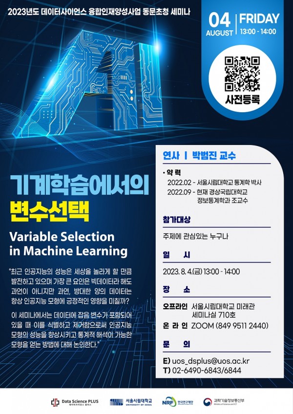 [서울시립대 DS플러스] 특강 개최 안내(기계학습에서의 변수선택_08/04(금) 13:00)
