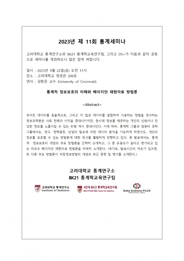 DS+, BK 2023년도 제 11회 통계세미나 개최 안내(09/22(금))