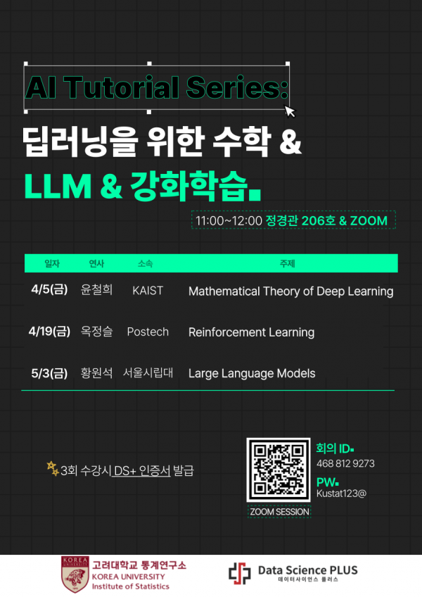AI Tutorial Series:딥러닝을 위한 수학 & LLM & 강화학습(3회) DS플러스 2024-03-20 DS플러스 0 1174 2024.03.20 19:16 사전신청: https://forms.gle/WZpQDcTTCjCjT8D2A 많은 관심과 참여 부탁드립니다.