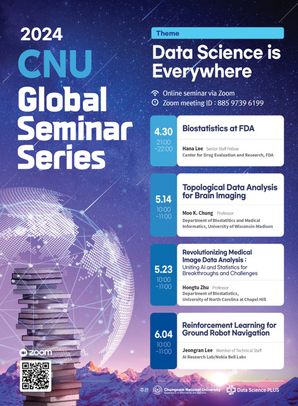 본 학과와 함께 DS플러스 사업을 수행하고 있는 충남대학교 DS플러스 사업단에서 'Revolutionizing Medical Image Data Analysis: Uniting AI and Statistics for Breakthroughs and Challenges'라는 주제로 세미나를 개최합니다.